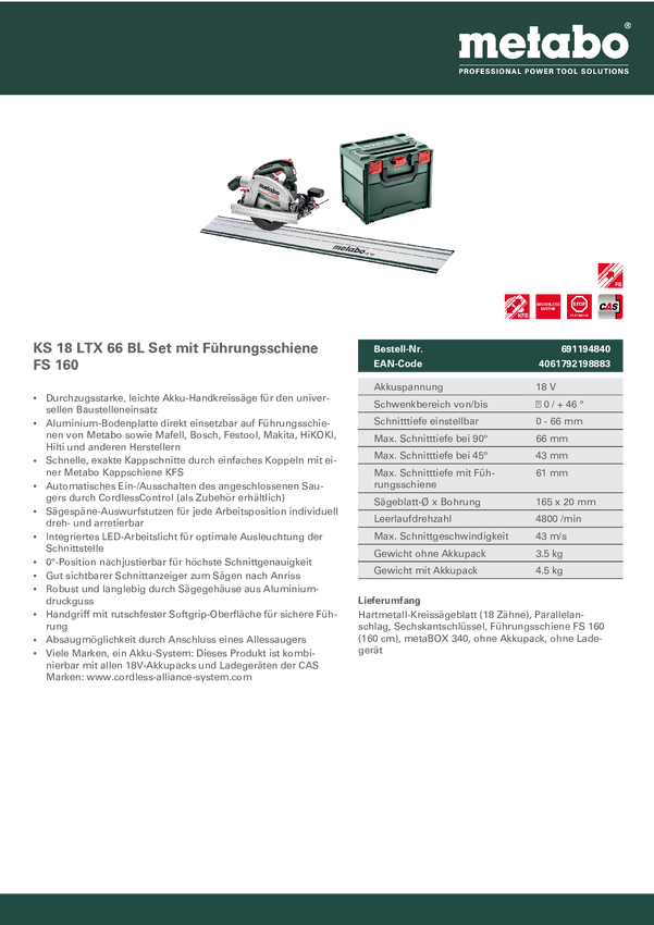 Zestaw piły tarczowej akumulatorowej Metabo Set KS 18 LTX 66 BL 18 V Głębokośc cięcia maks. (90°) 66 mm