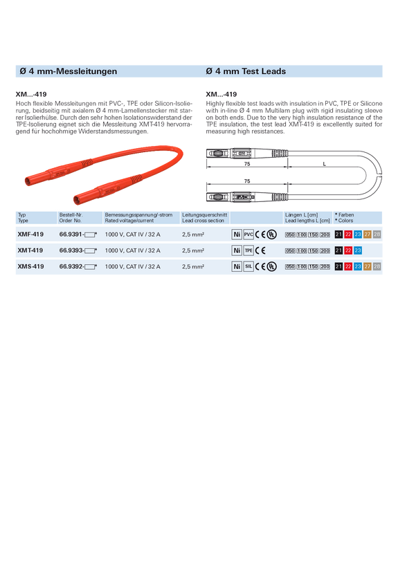 66.9391-20022 Przewód pomiarowy Stäubli XMF-419, 2.00 m, czerwony