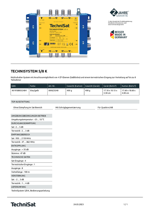 Multiprzełącznik SAT, kaskadowy TechniSat Technisystem 5/8 K, Kaskade Wejścia (multi-switch): 5 (4 sat/ 1 naziemne) Iloś