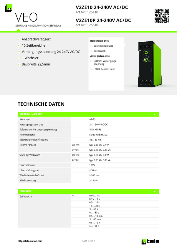 tele 125110 Przekaźnik czasowy V2ZE10 24-240V AC/DC, 0.05 s - 100 h, 400 V/AC, 8 A, 1 szt.