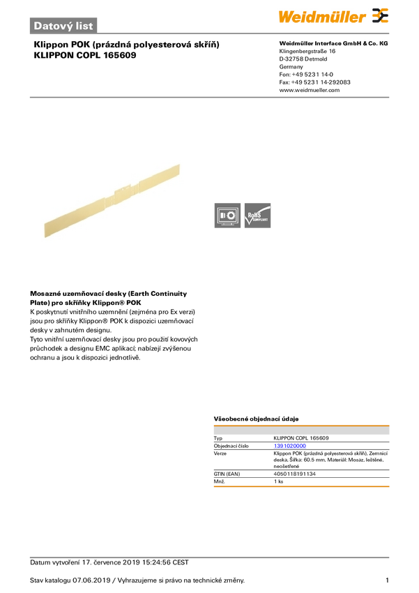 Płyta uziemiająca Weidmüller KLIPPON COPL 165609 (D x S) 656 mm x 60.5 mm mosiądz 1 szt.