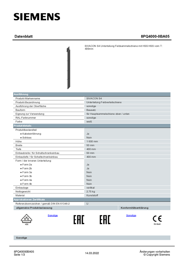 8PQ40000BA05 Pooddział Siemens 8PQ4000-0BA05 (D x S x W) 400 x 50 x 1600 mm tworzywo szt...