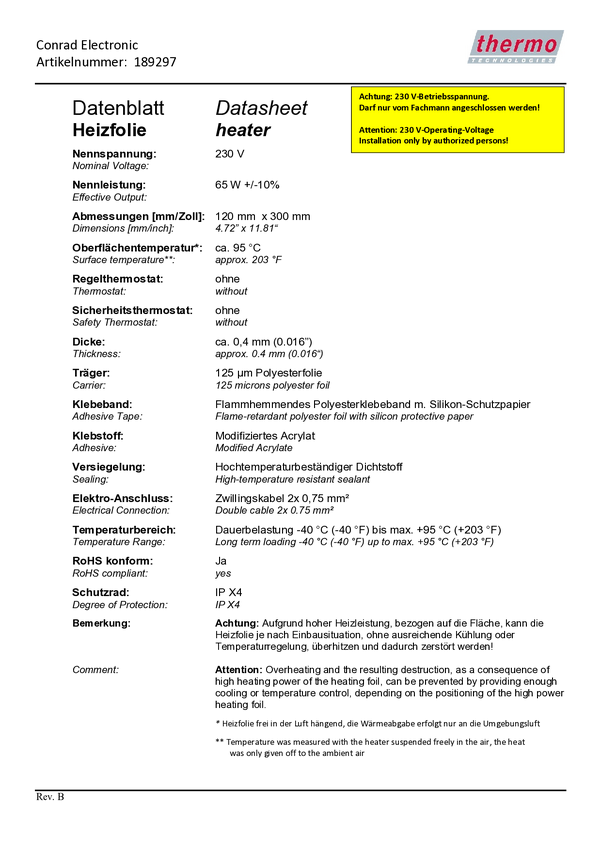 2145233 Folia grzewcza Thermo TECH 2145233, 95 °C, 65 W, IPX4, (D x S) 300 mm x 120...