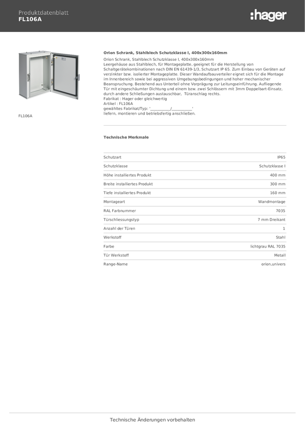 FL106A Hager FL106A Szafka 300 x 400 x 160 stal szaro-biały (ral 7035) 1 szt.