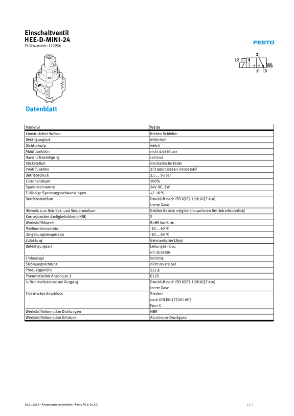 172956 Zawór załączający FESTO HEE-D-MINI-24 172956, 2.5 do 16 bar