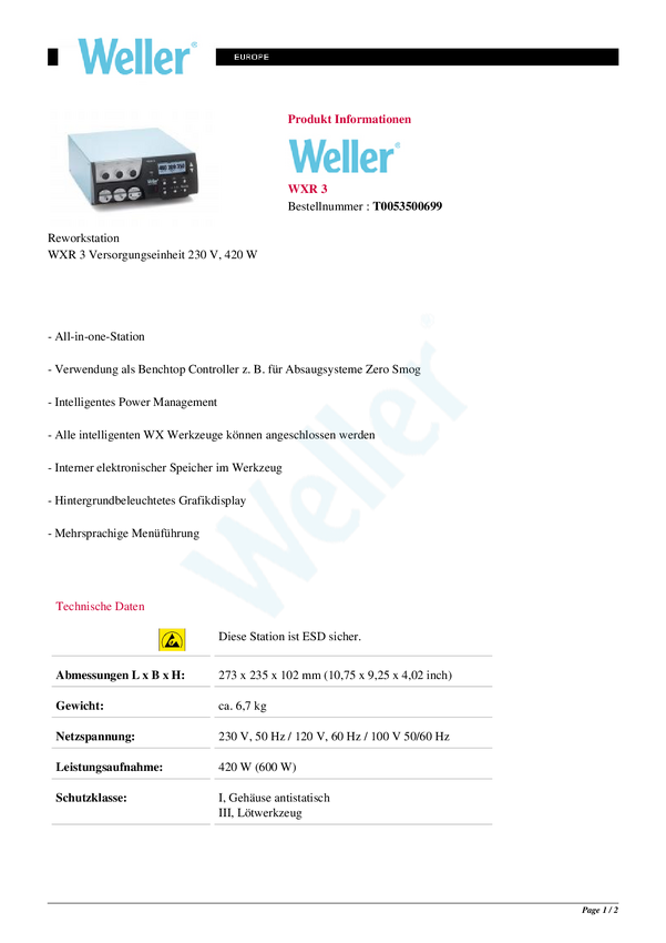 T0053500699N Zasilacz do stacji lutująco-rozlutowującej Weller WXR 3 230 V T0053500699N...