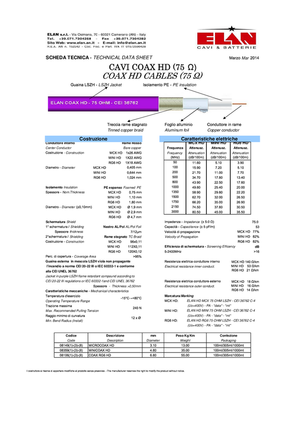 Kabel koncentryczny ELAN 83591, Średnica zewnętrzna: 4.8, RG179, 75 Ω, fioletowy, Produkty w metrach bieżących