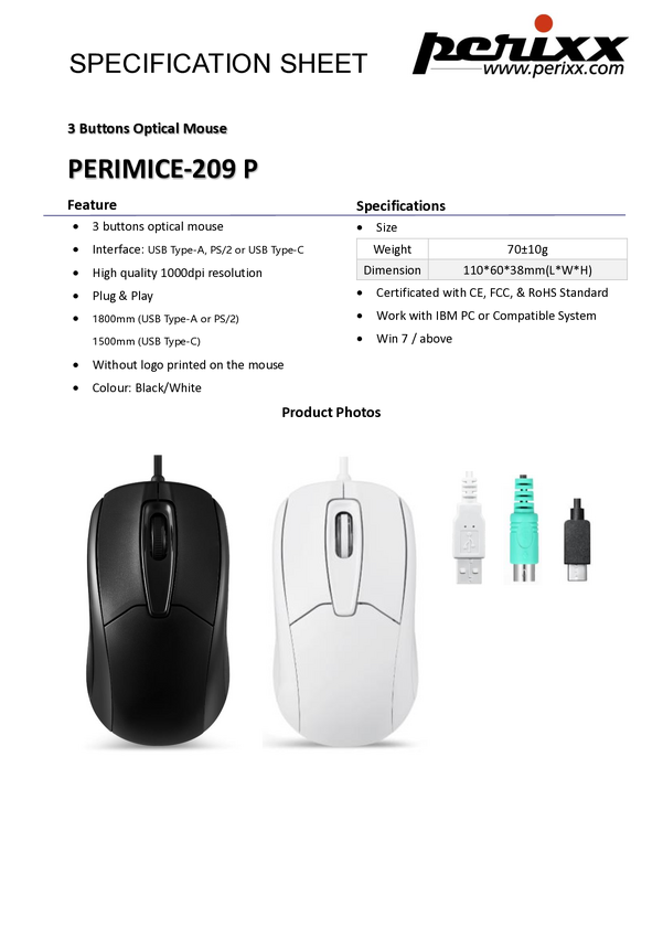 10442 Mysz przewodowa Perixx PERIMICE-209 P Black 1000 dpi