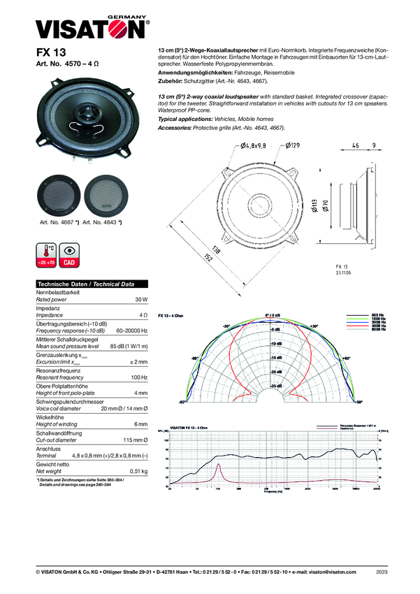Visaton FX 13 - 4 Ohm 5 cal 13 cm 2-drożny głośnik współosiowy 30 W 4 Ω Wodoodporna membrana polipropylenowa