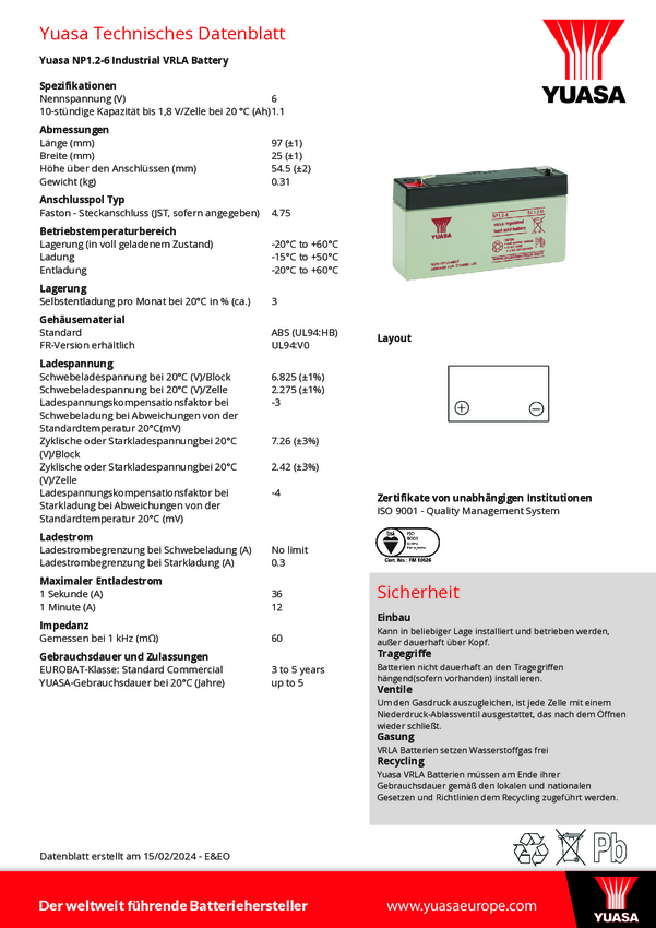 NP1.2-6 Akumulator ołowiowy Yuasa NP12-6 NP1.2-6, AGM, 6 V, 1.2 Ah