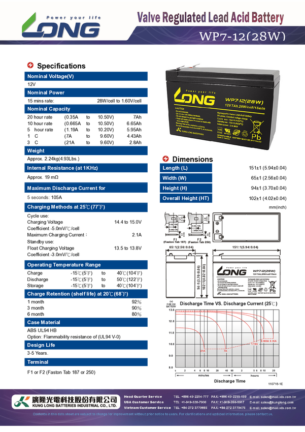 Akumulator ołowiowy Long WP7-12(28W)-M/F2 WP7-12(28W)-M/F2, AGM, 12 V, 7 Ah