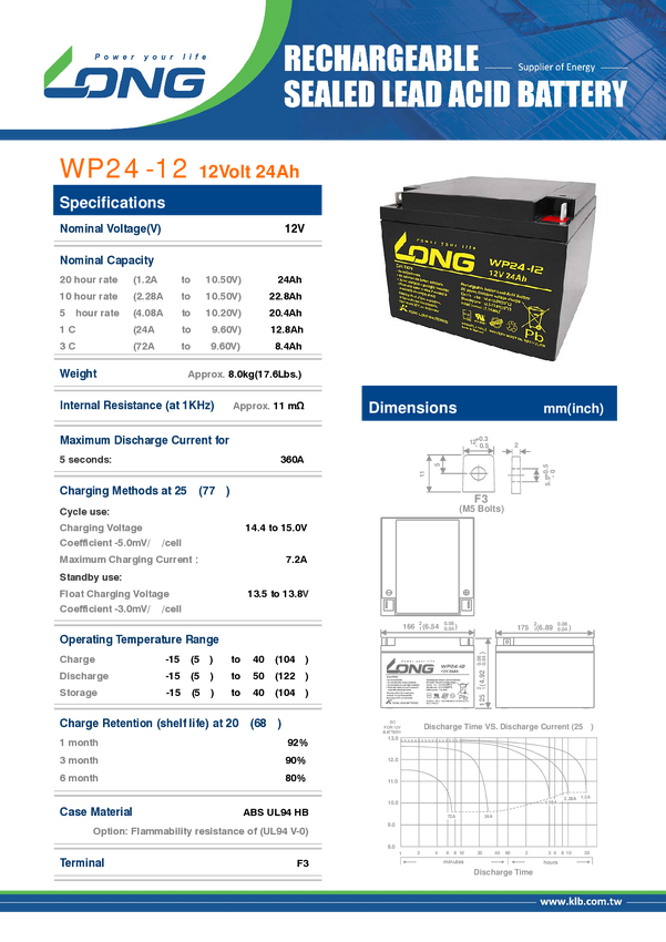 WP24-12 Akumulator ołowiowy Long WP24-12 WP24-12, AGM, 12 V, 24 Ah