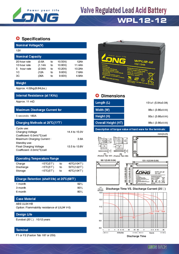 WPL12-12 Akumulator ołowiowy Long WPL12-12 WPL12-12, AGM, 12 V, 12 Ah