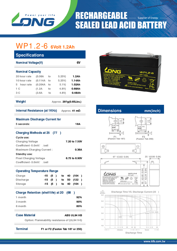 WP1.2-6 Akumulator ołowiowy Long WP1.2-6 WP1.2-6, AGM, 6 V, 1.2 Ah