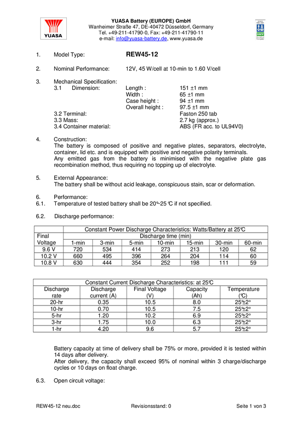 REW45/12 Akumulator ołowiowy Yuasa REW 45 - 12 REW45/12, AGM, 12 V, 8 Ah