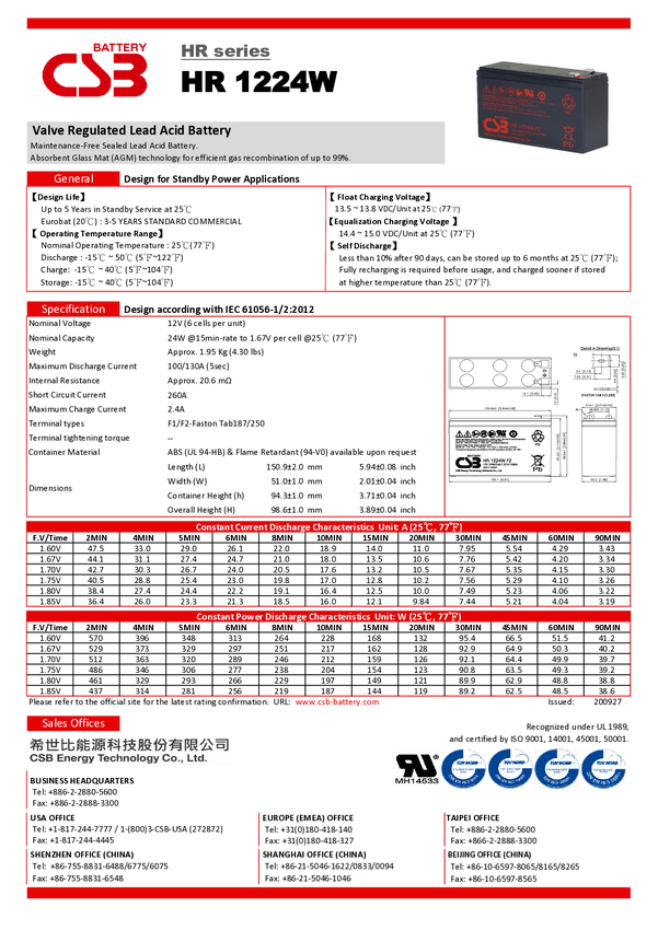 HR1224WF2F1 Akumulator ołowiowy CSB Battery HR 1224W high-rate HR1224WF2F1, AGM, 12 V,...