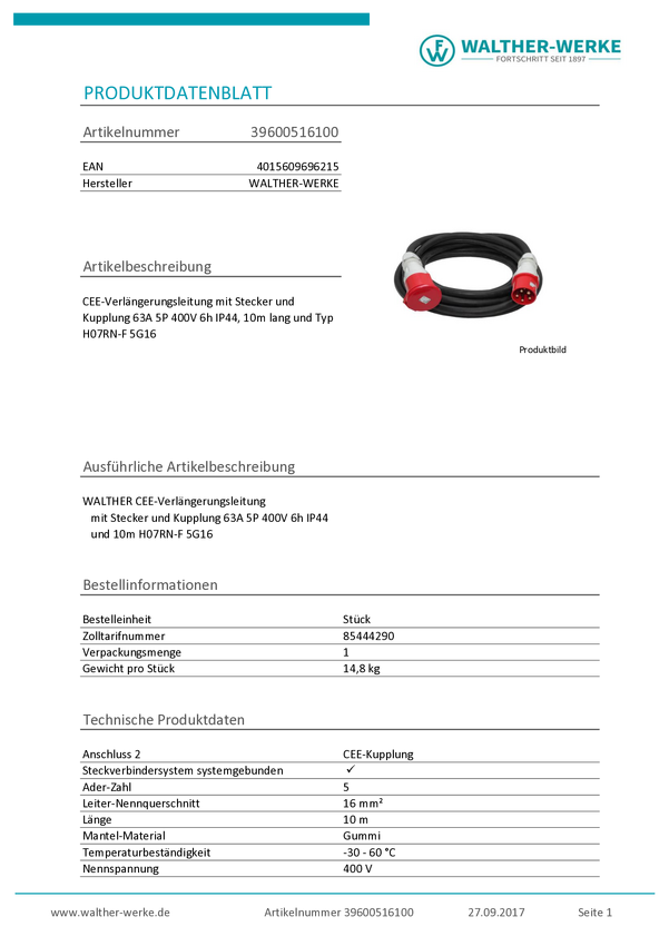przedłużacz Walther Werke 39600516100 39600516100, gniazdka: 1, 400 V, 63 A, 10.00 m