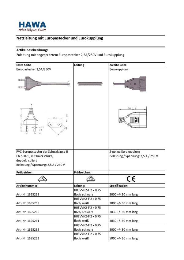 przedłużacz HAWA R696, gniazdka: 1, H03VVH2-F 2X 0,75 mm², 230 V, 2.5 A, 3.00 m