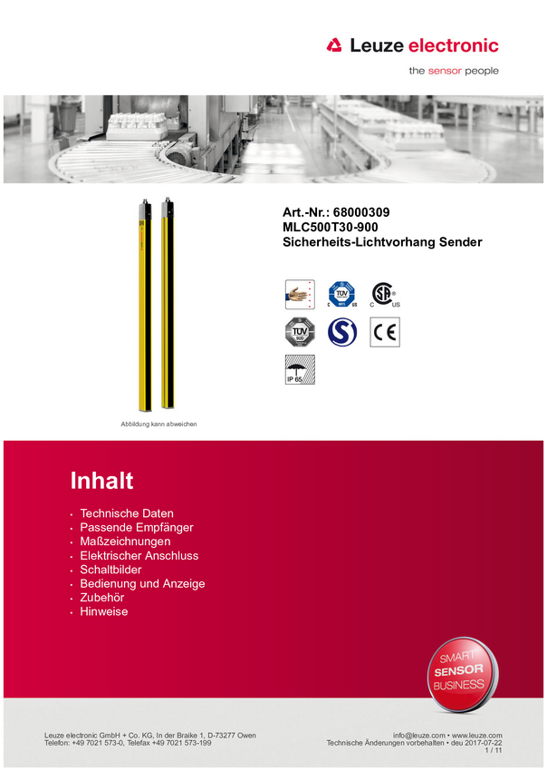 68000309 Leuze Electronic Kurtyna bezpieczeństwa MLC500T30-900 Maksymalny zasięg 10...