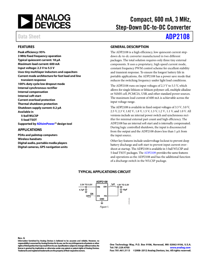 ADP2108: Compact, 600 mA, 3 MHz, Step-Down DC-to-DC Converter