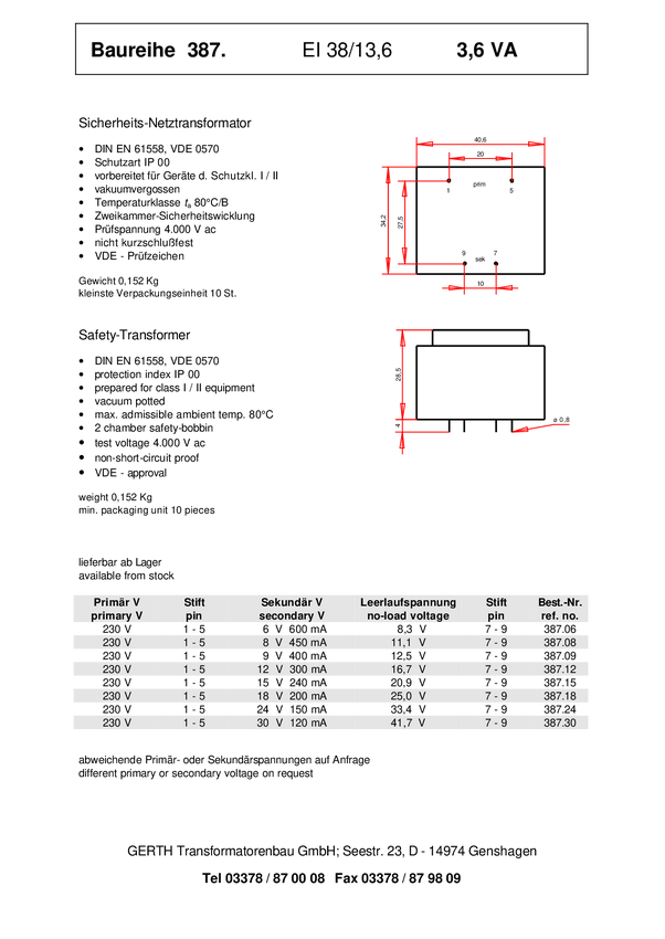 Transformator do PCB, EI 38/13,6 Gerth PTG386002 230 V N/A N/A 3.6 VA