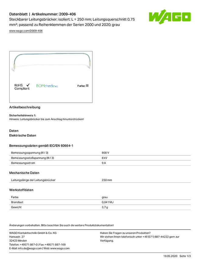 2009-406 WAGO 2009-406 Mostek zwierający szary 100 szt.