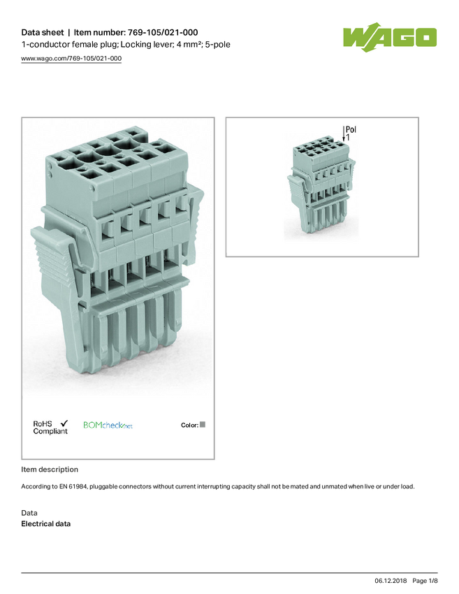 X-COM gniazdo 1-przewodowe 5-biegunowe szare WAGO 769-105/021-000 Zawartość: 25 szt.