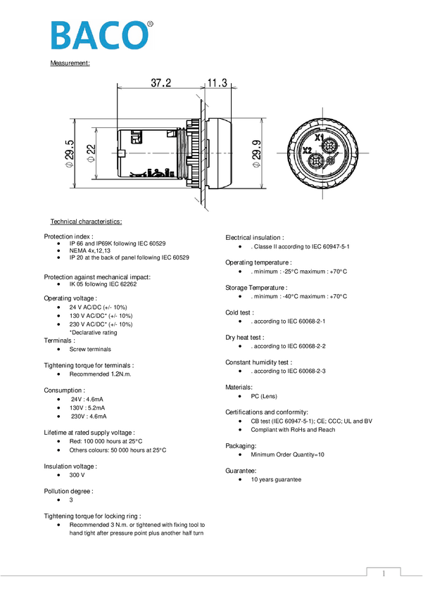 224604 BACO L20SC40L Podświetlenie wskaźnika żółty 24 V 1 szt.