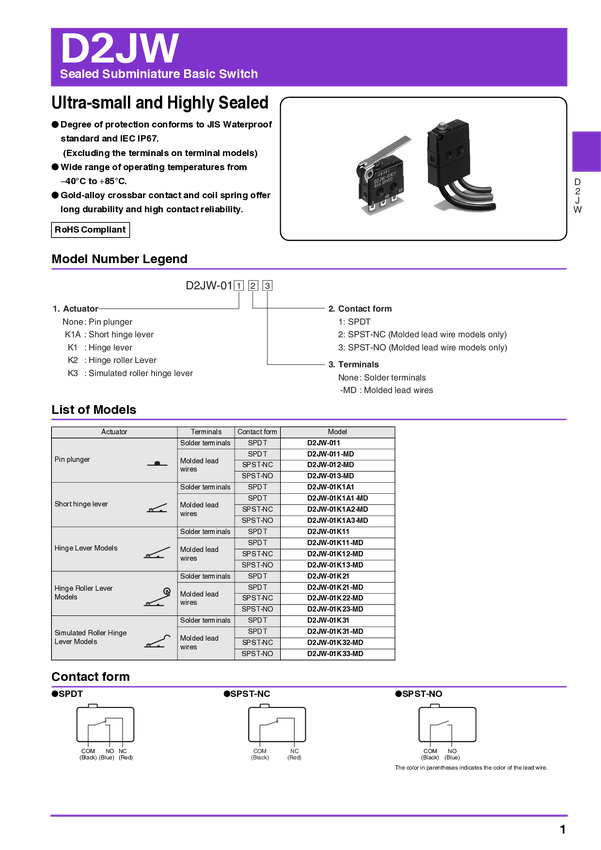 D2JW-01K11-MD Omron D2JW-01K11-MD Mikroprzełącznik, 1 zestyk przełączny, 1 x wł/(wł),...