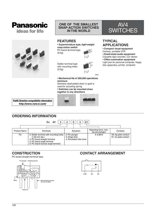 AV4544J Mikroprzełącznik AV4544J 30 V/DC 0.5 A 1 x wł/(wł) Panasonic IP40 c...