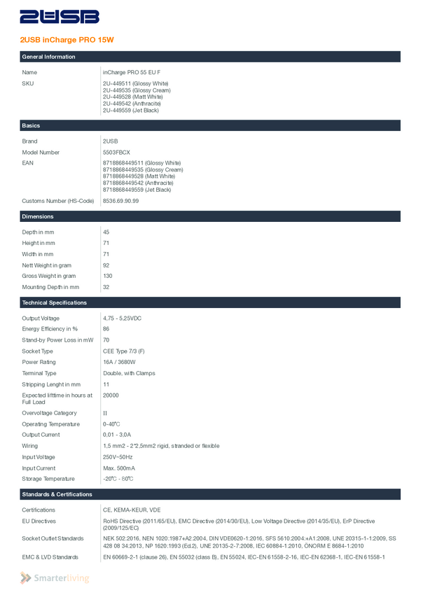 2USB 2U-449535 Gniazdo wtykowe ze stykiem ochronnym z wyjściem ładowania USB, zabezpieczenie przed dziećmi, VDE IP20 kre