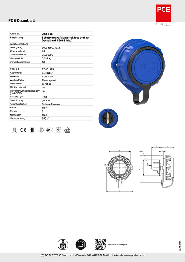 Gniazdo elektryczne PCE 20351-9b, 16A, 230 V / 50 Hz, niebieskie, IP68,