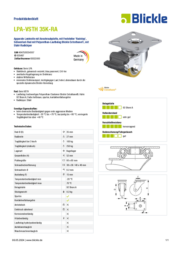 Blickle 935487 LPA-VSTH 35K-RA Rolka do urządzenia Średnica koła: 35 mm Maksymalne obciążenie: 100 kg 1 szt.