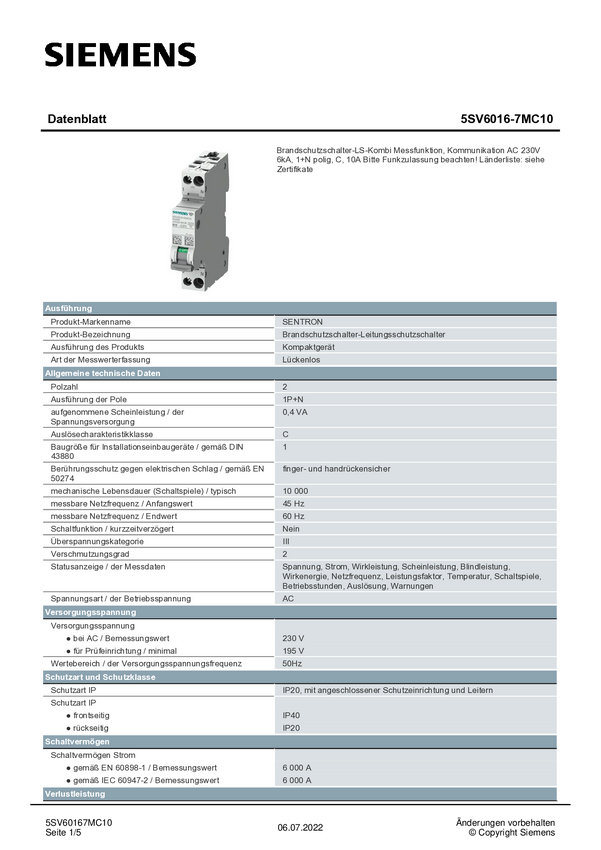 5SV60167MC10 Siemens 5SV60167MC10 5SV6016-7MC10 Przełącznik ochrony przeciwpożarowej 2 s...