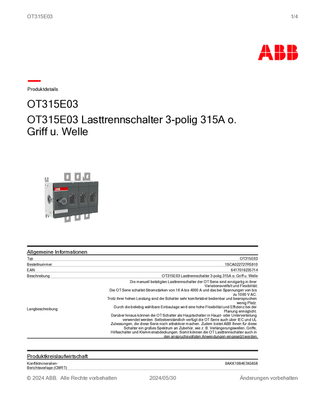 1SCA022727R5910 Przełącznik rozłączający ABB OT315E03 1SCA022727R5910, 3 styki, 315 A