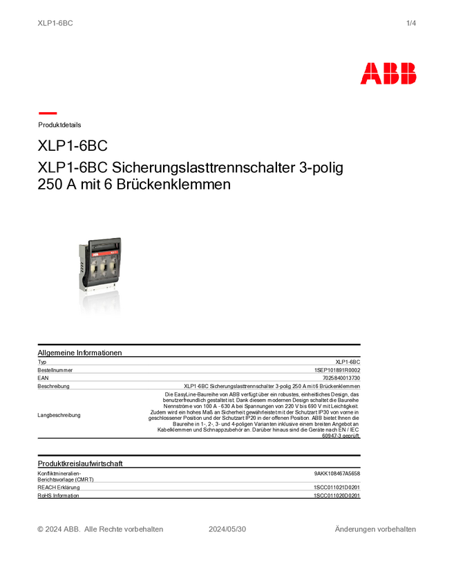 1SEP101891R0002 ABB 1SEP101891R0002 XLP1-6BC Rozłącznik bezpiecznikowy Rozmiar bezpiecznika...