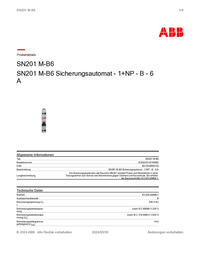 ABB 2CSS275101R0065 SN201 M-B6 Wyłącznik automatyczny 2 styki