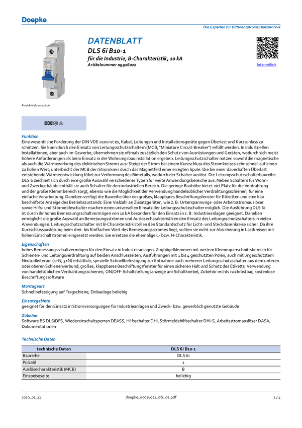 Wyłącznik automatyczny Doepke DLS6I B10A 1polig 10KA 09916021, 1 styk, 230 V, 10 A