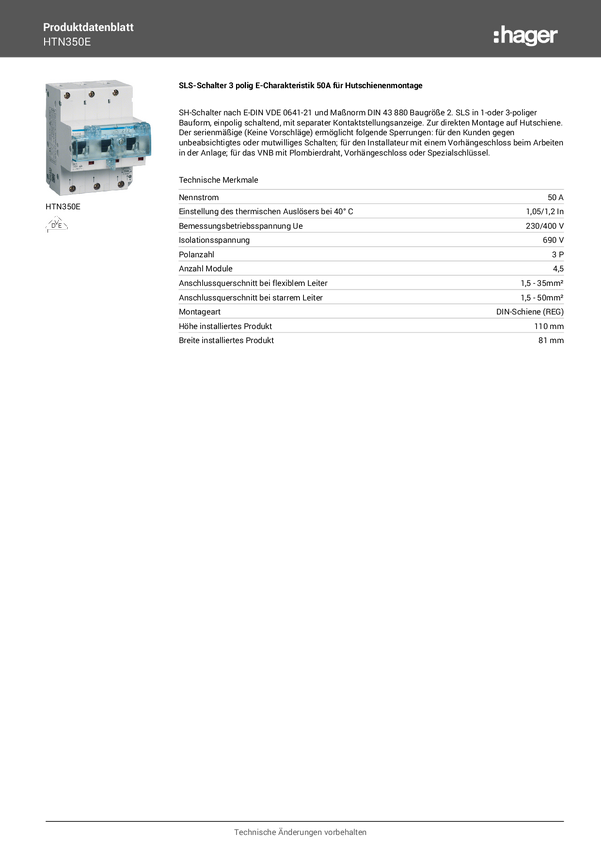 HTN350E Hager HTN350E HTN350E Wyłącznik automatyczny 3 styki 35 A
