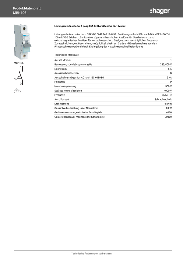 MBN106 Hager MBN106 MBN106 Wyłącznik automatyczny 1-fazowy 6 A 230 V, 400 V