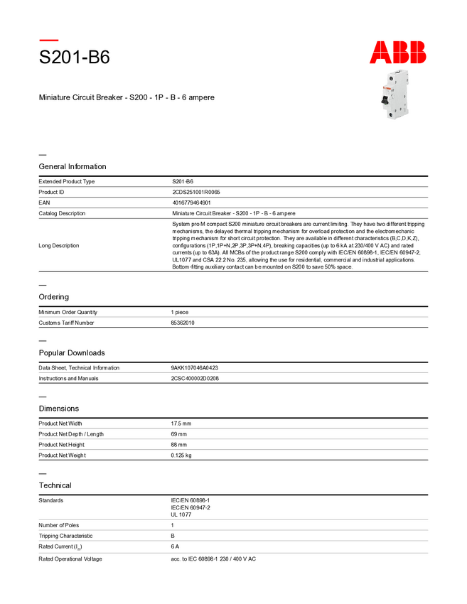 2CDS251001R0065 Wyłącznik automatyczny ABB S201-B6 2CDS251001R0065, 1 styk, 230 V, 6 A