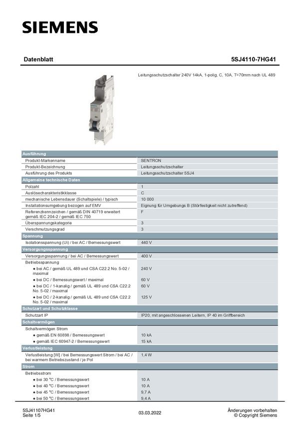 5SJ41107HG41 Siemens 5SJ41107HG41 5SJ4110-7HG41 Wyłącznik automatyczny 10 A 230 V, 400 V