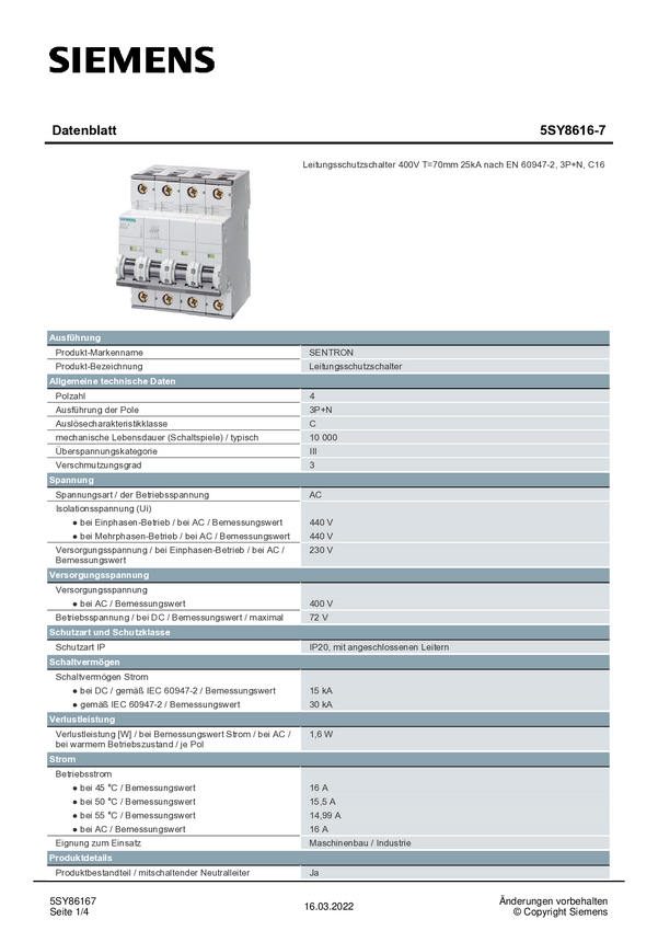 5SY86167 Wyłącznik automatyczny Siemens 5SY8616-7 5SY86167, 230 V, 400 V, 16 A
