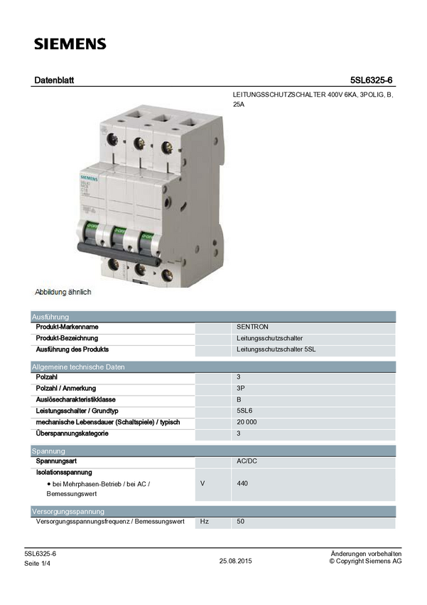 5SL63256 Wyłącznik instalacyjny Siemens LS-SCHALTER 6KA, B / 6 kA, 400V, 25A
