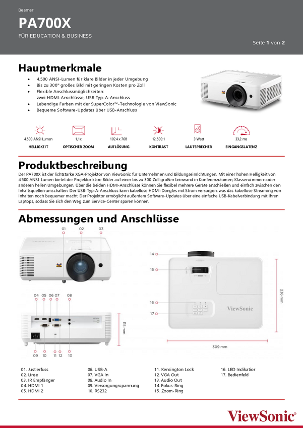 Viewsonic Rzutnik PA700X Laser ANSI-Lumen: 4500 ANSI lumenów 1024 x 768 XGA 3000000 : 1 biały