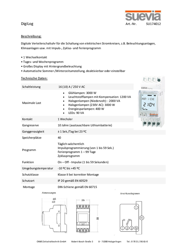 SU174012 Suevia DigiLog Przekaźnik czasowy na szynę DIN cyfrowy 230 V/AC
