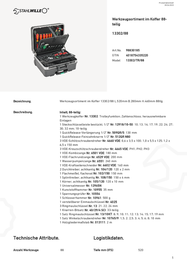 98830185 Walizka narzędziowa z wyposażeniem Stahlwille 13302/TR/88 98830185