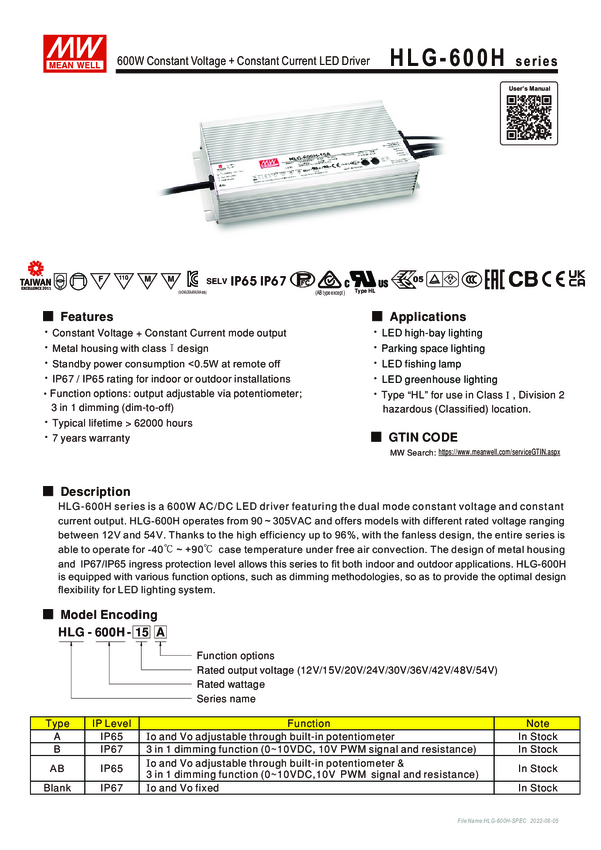 HLG-600H-30 MEAN WELL Sterownik LED 600 W 20 A 30 V nie nadaje się do ściemniania 1 szt...