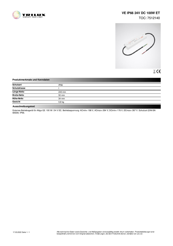 7512140 Trilux VE IP66 24V DC100WET Transformator LED 60 W 24 V nie nadaje się do ś...