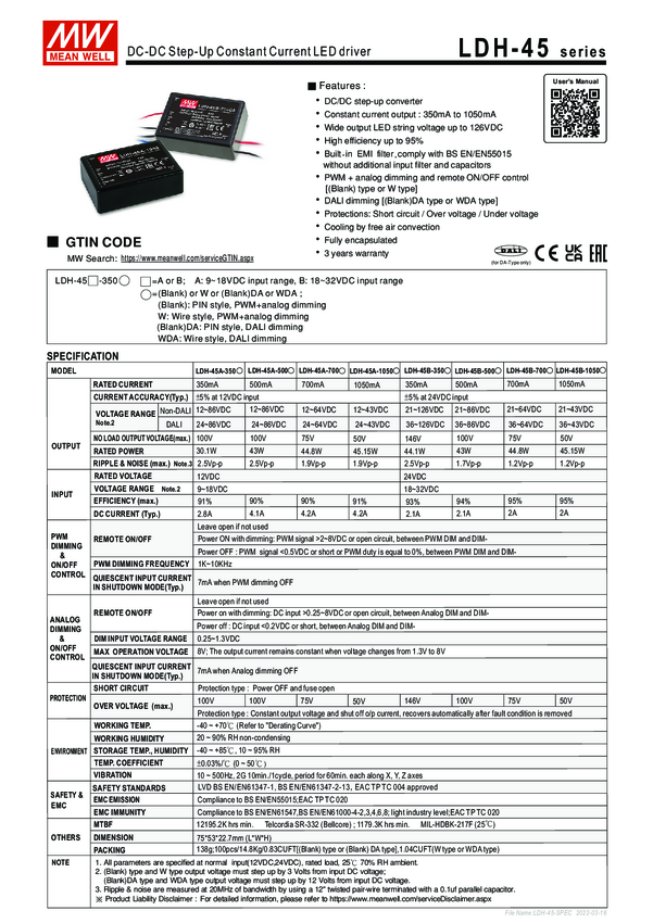 LDH-45B-1050WDA MEAN WELL LDH-45B-1050WDA Sterownik LED Stałonaprądowy 45.15 W 1050 mA 36 -...